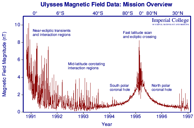 This figure shows the magnetic field magnitude at the Ulysses spacecraft from launch in October 1990 until early 1997. Around 150 million vector magnetic field measurements were returned during this time.
