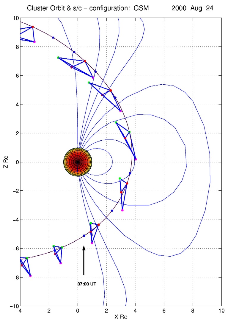 The magnetometers (FGM) on the four Cluster spacecraft were successfully commissioned in flight on 22 to 24 August. Cluster's eccentric elliptical orbit currently has an apogee deep in the tail of the Earth's magnetosphere, right behind the Earth, in such a way that the spacecraft quartet is eclipsed for several hours by the Earth. Perigee, however, is on the sunlit side of the Earth, close to the noon meridian. This means that as the spacecraft swing around the Earth's dayside, they traverse, on either side of perigee, the regions of the magnetosphere known as the cusps, where the configuration of the magnetosphere has a funnel-like opening, accessible to the entry of solar wind plasma. In about six months, Cluster's apogee will be in the sunward direction from the Earth, when the external cusps will be subject to observations by the whole payload. These observations represent one of the primary objectives of the mission.