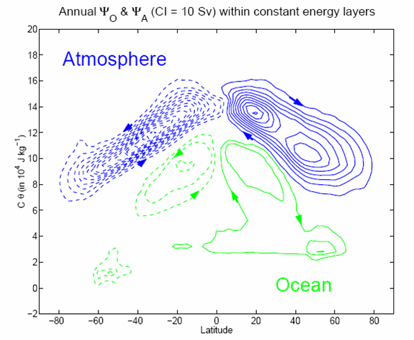Ocean (green) & Atmosphere (blue) carry energy across a latitude circle