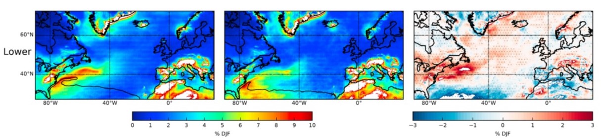 This figure shows the frequency of occurence of events with negative Ertel PV at low levels in the ERA5 dataset during the cold season. The panels on the left and in the middle display this quantity for different states of the Gulf Stream, as represented by the location of the 21 degree Celcius isotherm (black line). The panel on the far right shows the difference between the two states.